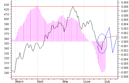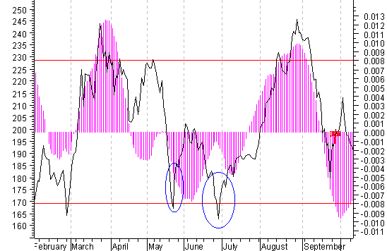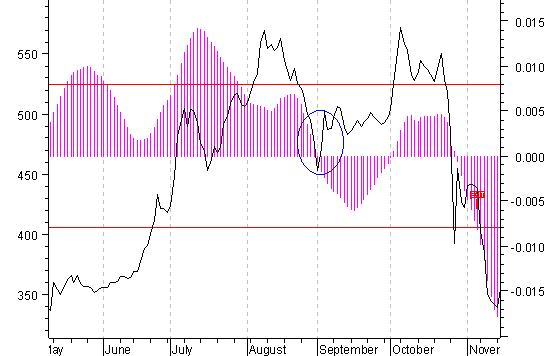 И что мы видим в дальнейшем? Классический для нашего рынка быстрый отскок, который означает локальное дно (в овале). В общем, все как всегда. Но если рассмотреть ситуацию одновременно с изображенным на рисунке в виде сиреневой гистограммы индикатором, то на предыдущей истории мы находим всего два участка, где были одновременно следующие события: новая волна бурного роста с последующим падением от максимума, сравнимым с майско-июньским 2002 года (с образованием на графике индекса РТС фигуры «голова-плечи»), при том, что индикатор, не дойдя до уровня продажи (нижняя красная горизонтальная линия), развернулся вверх. Это март – июль 2000