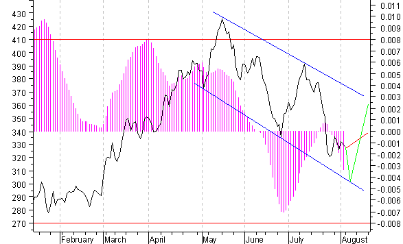 Сценарий 1 (зеленая линия на рисунке). Учитывая то, что чаще всего развороты на российском рынке происходили после резких падений с еще более резким отскоком, можно предположить, что движение вниз не закончено и весьма вероятно достижение нижней границы падающего коридора, после чего цены двинуться к верхней границе коридора. Этот сценарий, на наш взгляд, наиболее вероятен, так как в его рамках индикатор не достигнув нового минимума развернется вверх (что и прогнозировалось в начале июля). Его вероятность я оцениваю как 0,45. Сценарий 2 (красная линия на рисунке). Если же исходить только из поведения индикатора, то разворот его вверх без достижения нового минимума может произойти и в результате медленного роста индекса РТС сразу или после сравнительно краткосрочного (1-2 недели) нахождения индекса в коридоре 320-339. Но все же этот сценарий я считаю менее вероятным - его вероятность 0,35. И, наконец, нельзя совсем исключить и совсем пессимистический сценарий - это пробой индексом нижней границы коридора. Надо признать, что такое поведение цен встретиться на индексе РТС впервые (достаточно продолжительное (по времени), но достаточно глубокое падение, причем на третьей волне падения (с мая) с очень низкими объемами торгов). Но в торговле на фондовом рынке бывают ситуации, встречающиеся и впервые. Вероятность этого сценария оцениваю как 0,2. В любом случае до пробоя коридора предпринимать какие-либо действия на рынке в среднесрочном плане не рекомендуется. P. S. При рассмотрении сценариев прошу не обращать внимание на время достижения экстремумов на рисунках - оно нарисовано, исходя из возможностей, которые дает Metastock при рассмотрени шкалы времени в будущем и может быть совершенно иным. |