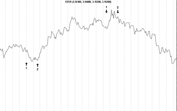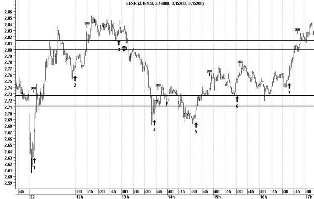 Рисунок 1. На этом графике, как Вы видите, существует по две пары сигналов. Нижние на покупку (лонг), верхние на продажу (шорт). Я не пытался на нем придерживаться точности, просто они показывают при каких направлениях движения цены нужно входить в рынок. Сигналы под цифрой один, это неправильный вход. Правильное направление, сигналы под цифрой 2. Постараюсь объяснить почему. Разбираем первую пару сигналов. Вход в покупку, пока рынок не изменил направление, не оттолкнулся от локального дна, очень рискован. Он может уйти еще ниже и не вернуться даже к уровню цены Вашей покупки. Где ставить стоп-лосс, в такой ситуации Вы также не сможете себе определить. Будет надежда на отскок обратно, будет надежда на разворот и в итоге – достаточно существенные убытки. Сигнал номер два, эта правильный вход в покупку. Рынок оттолкнулся от локального дна, которое будет являться для Вас ориентиром для постановки стоп-лосса. Та же ситуация и с верхней парой сигналов. Первый сигнал находиться до определения локального максимума. Второй сигнал, после его появления. Локальные минимумы и максимумы, “хай” и “лоу” на сленге трейдеров, являются существенной составляющей для определения уровня постановки защитной позиции. Так, как самый сложный психологический вопрос: - “Что взять в качестве индикатора постановки защитной позиции?” И именно для каждой отдельно взятой позиции. Этим индикатором и будут являться предыдущие локальные минимумы при покупке и локальные максимумы при продаже. Стоп-лосс необходимо ставить чуть ниже (выше) этих уровней. Более точно, зависит от того, с каким маржинальным плечом Вы работаете. Чем выше объем плеча, тем более коротким должен быть уровень поимки “лося”. Это необходимо для снижения суммарных потерь вашего счета. К примеру, если Вы работаете только со своими средствами, то 0,5% так и останутся половиной процента убытка, но при плече один к трем, они превратятся уже в полтора процента убытка. Надо стараться ограничивать размер потерь. Дисциплинированно ограничьте для себя этот размер, к примеру, не более двух процентов. И жестко его придерживайтесь. Дисциплина на рынке, мы уже об этом говорили, самый главный фактор. При средне- и долгосрочной игре применяется метод защитной приостановки, чтобы остаться при своих. То есть, уровень стоп-лосса ставиться выше уровня вашей покупки, и ниже уровня продажи, на размер затрат пришедшихся на эту сделку. Это комиссионные брокеру и бирже, депозитарный сбор и т.д. То при торговли внутри дня подобный метод может привести к слишком низкой результативности вашей работы и слишком большому количеству сделок. От этого, правда, в выигрыше будет Ваш брокер, чему он будет конечно рад. Это связано с тем, что внутри дня колебания бывают достаточно большими. И войдя в рынок по одной цене, после этого вы ее еще не раз увидите. А при уровне защитной приостановки ниже (выше) локальных минимумов (максимумов) Вы страхуетесь от излишней частоты без результативных сделок, и при этом, Вы страхуетесь от убыточности позиции, если внутри дневная тенденция направлена в противоположную сторону. Рассмотрим несколько практических примеров. На рисунке 2 представлен минутный график РАО ЕЭС России, за 22 февраля 2001 года. Рассматриваем вариант игры от покупки, т.е. – лонг.